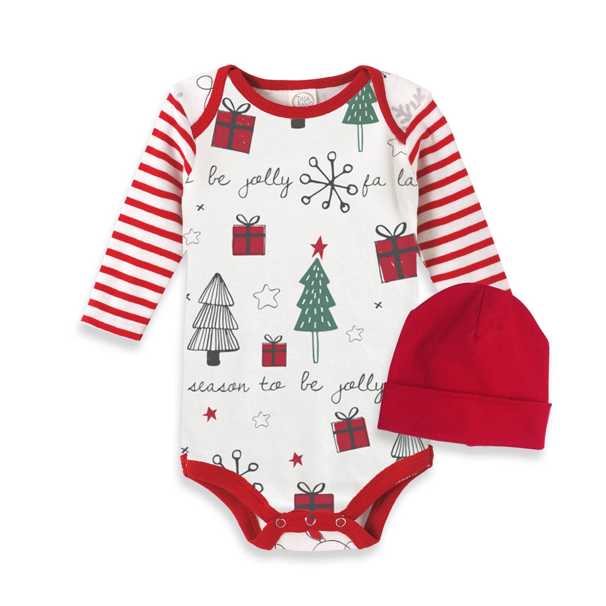 Baby Christmas Season Bodysuit & Hat Set. Soft and stretchy 100% cotton rib material is so gentle against baby's skin. Bodysuit has an envelope neck and snaps for easy on and off and changes.