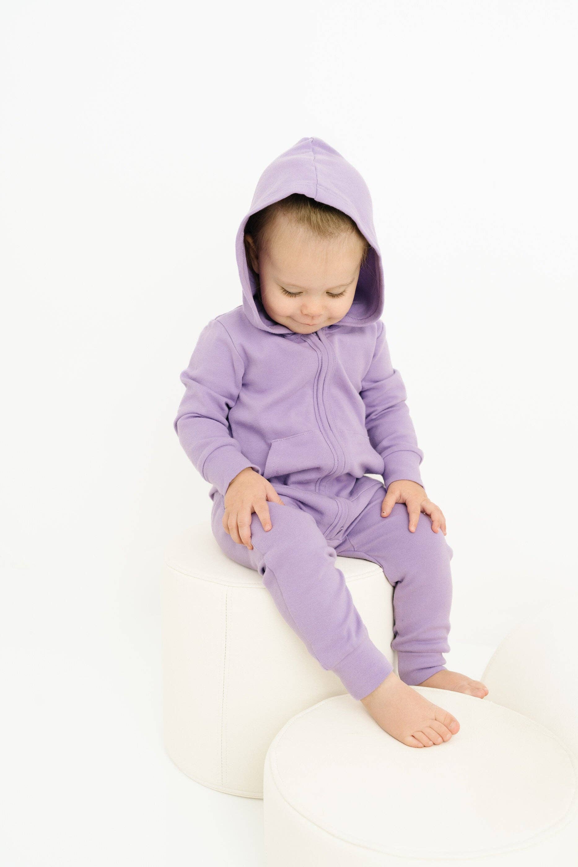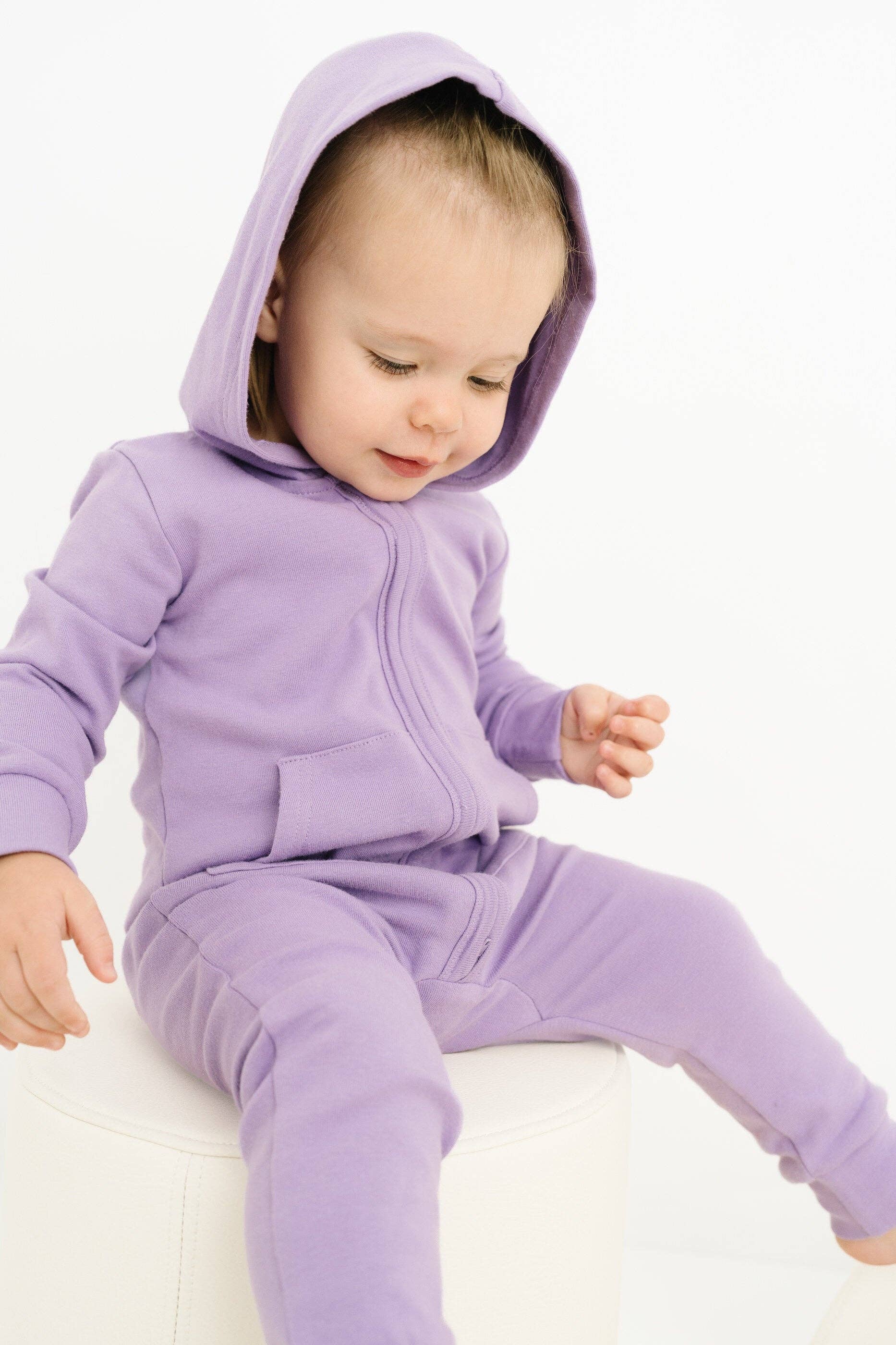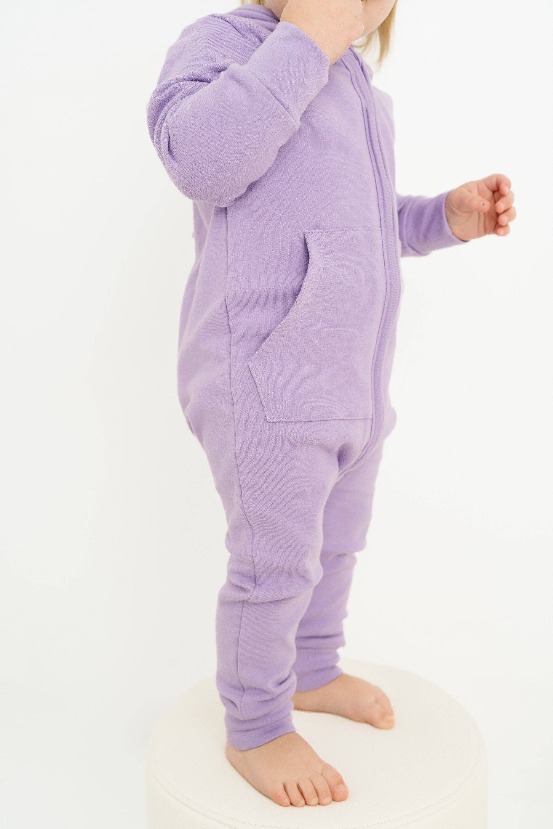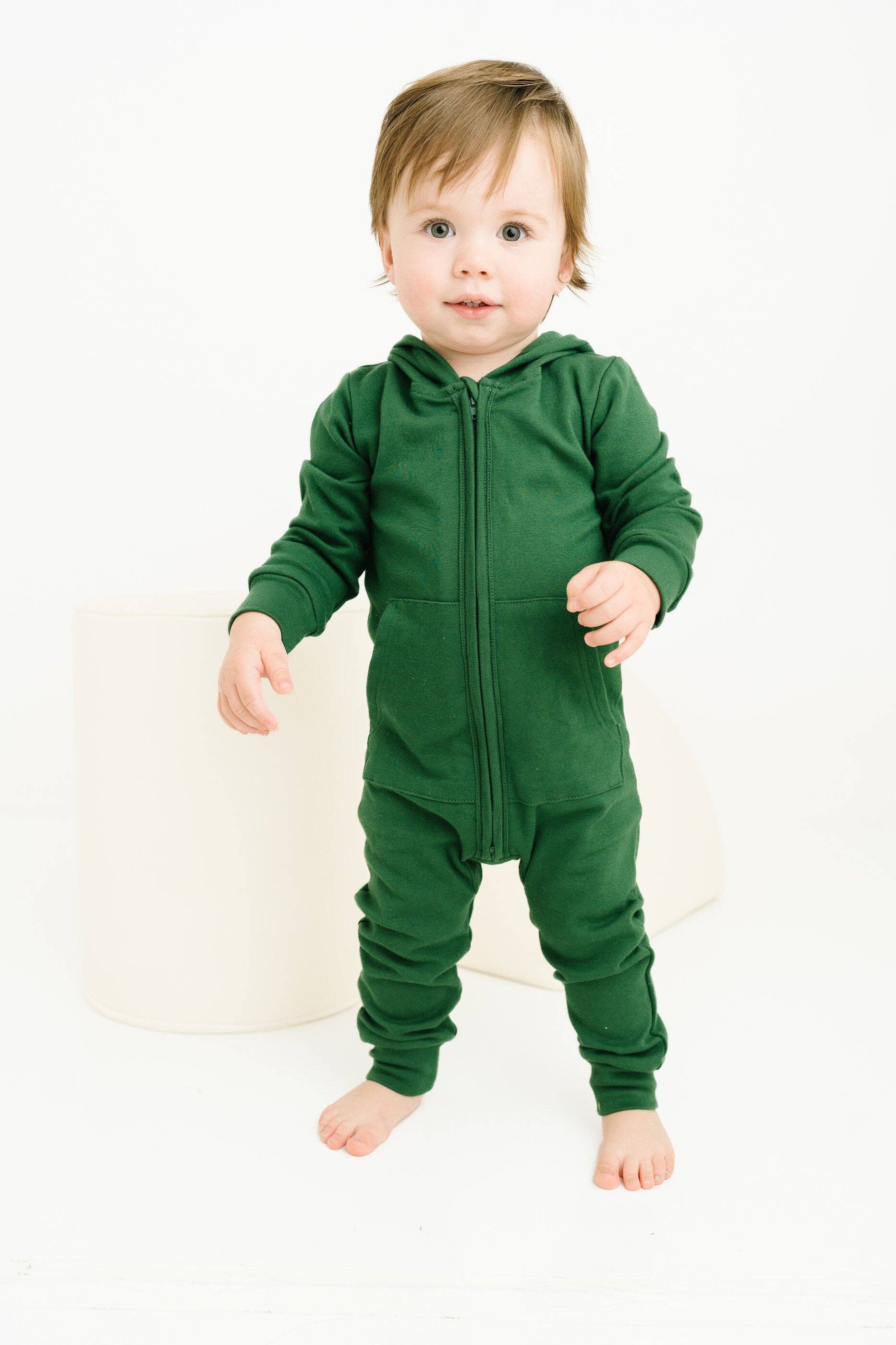 Grab this cute and fun double zippered one piece sweatshirt romper for the littlest ones in your life. Babies and toddlers alike will love the soft and stretchy fabric. Fully functional pockets add to the beauty of this outfit. Plus the hood with save you in a pinch when the wind, rain or cold air hits. The double zipper makes for easy diaper changes. No loose cords or snaps for safety.