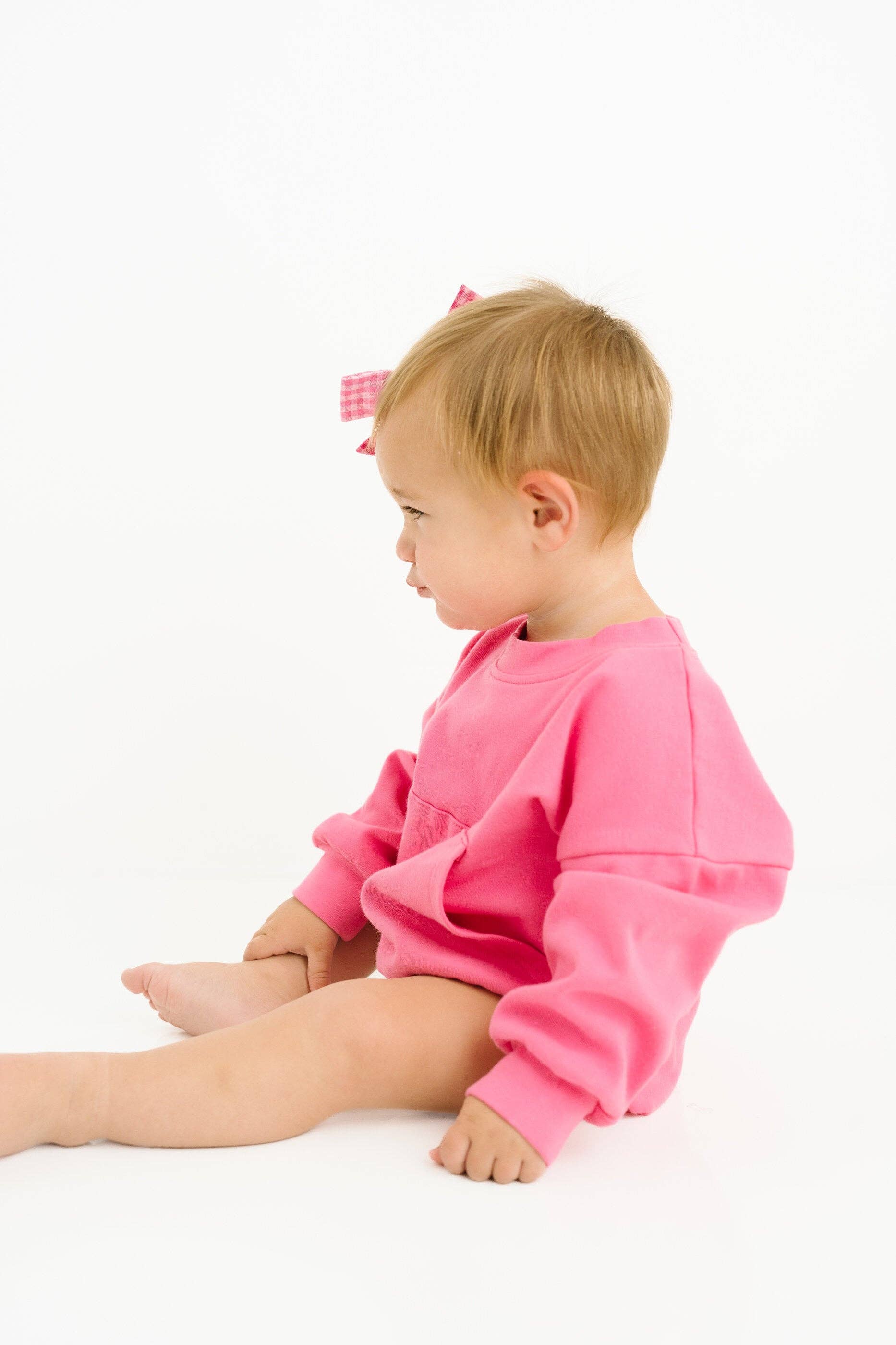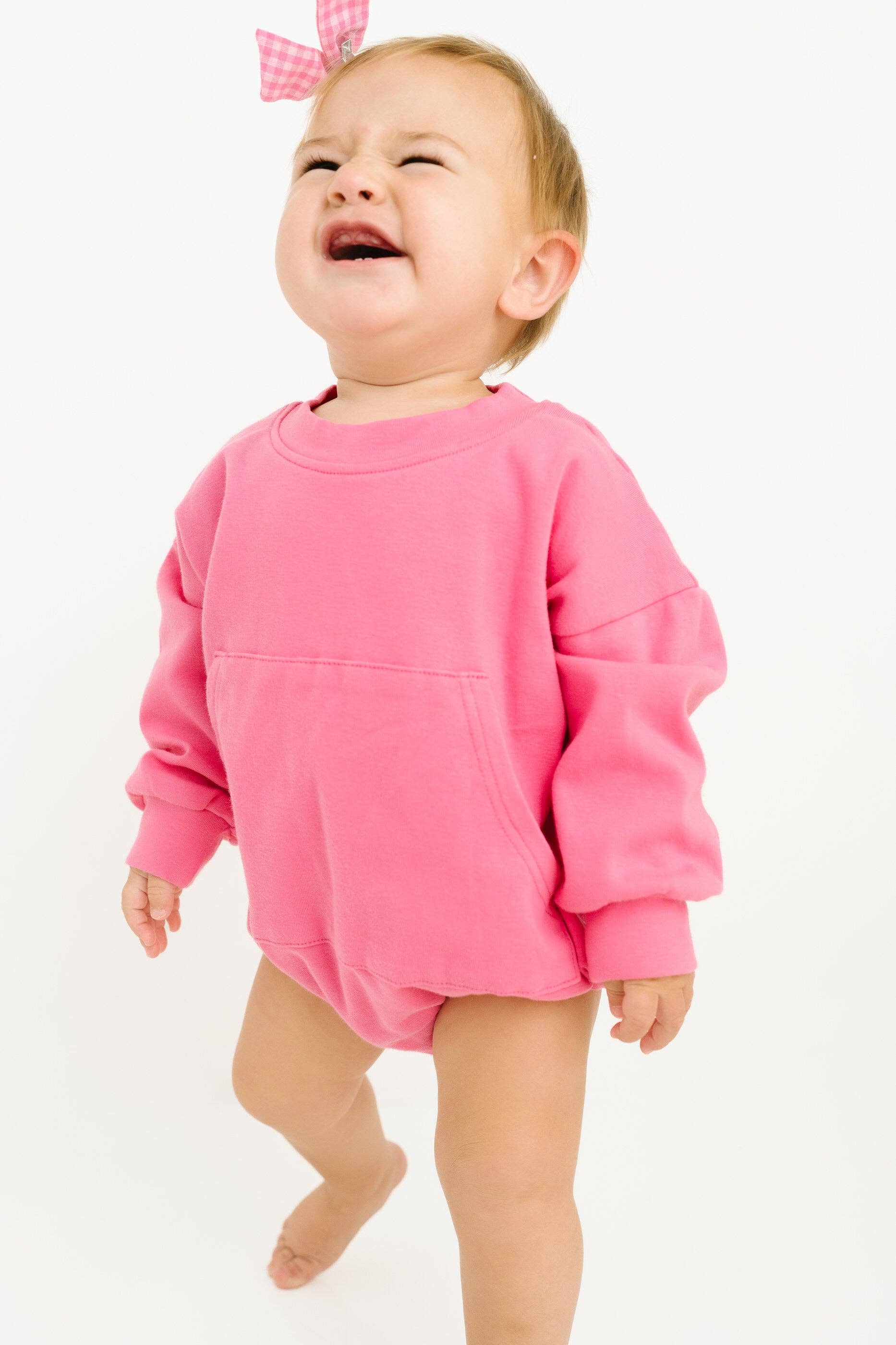 Soft + Stretchy! Functional pocket, oversized fit, and metal snap button closure for easy diaper changes.