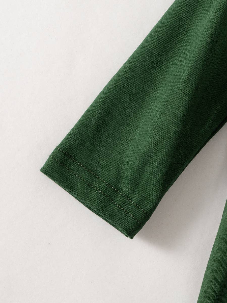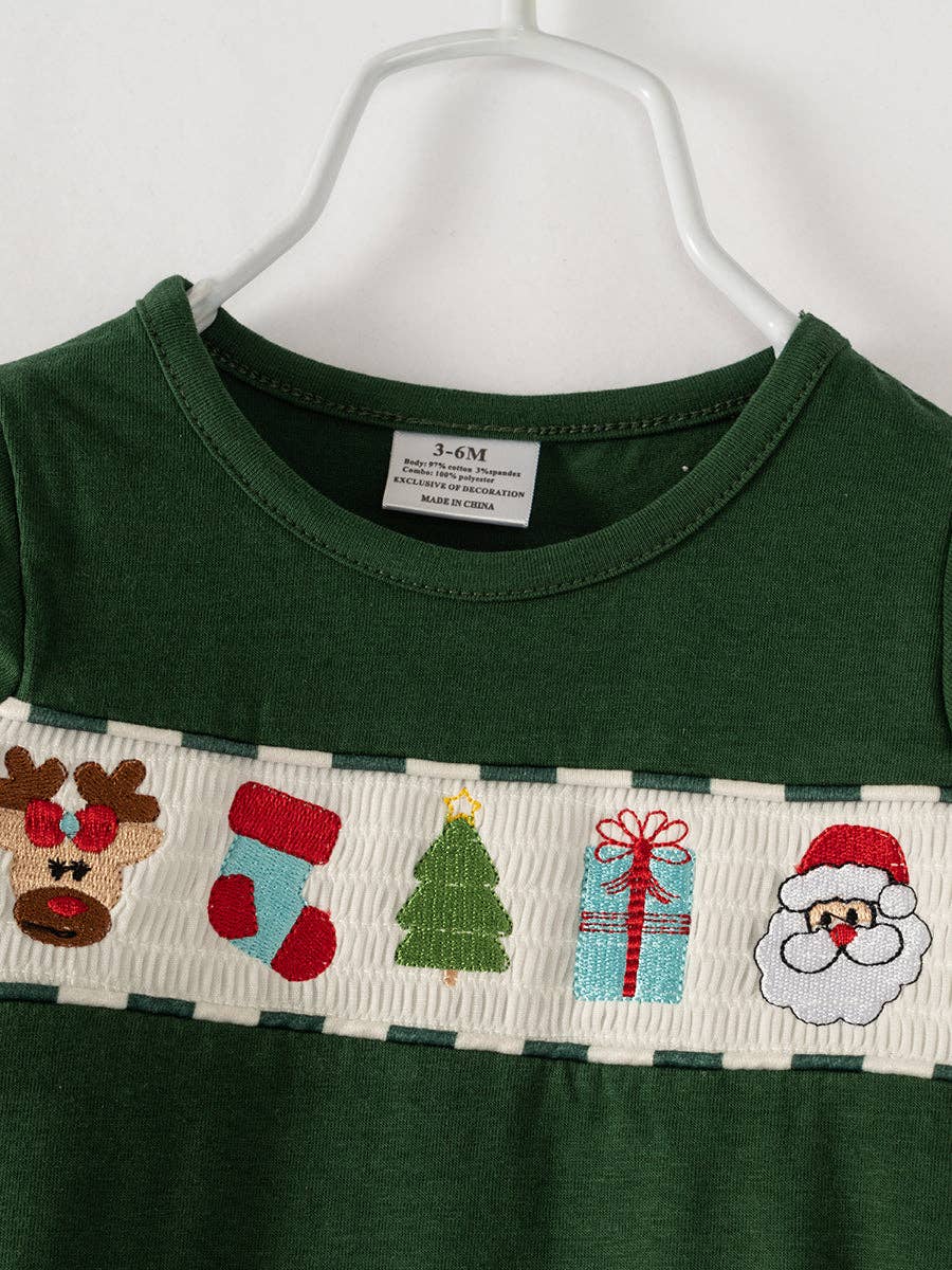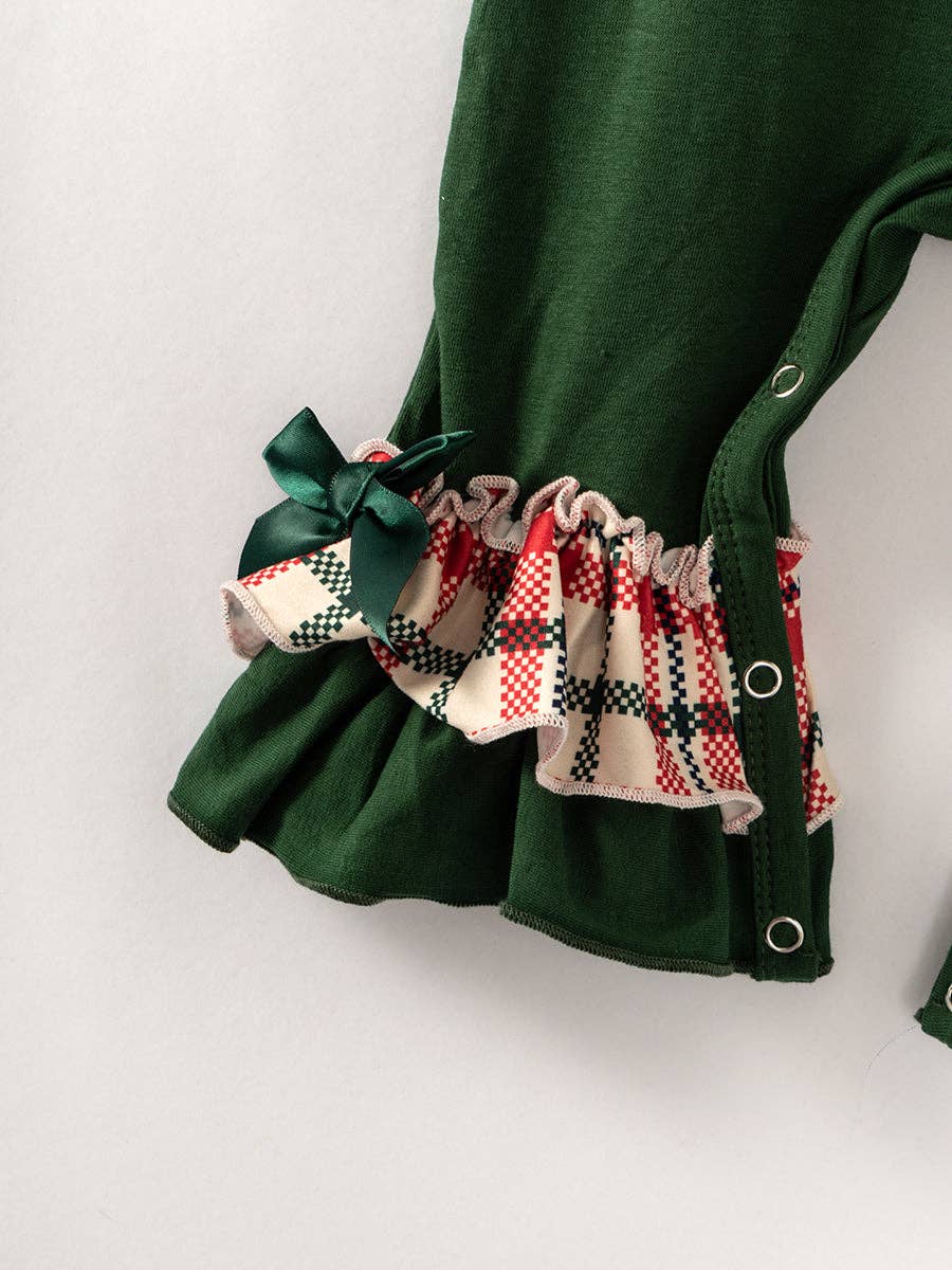 Perfectly trimmed in plaid and with a deep green body and topped with holiday bows. This outfit makes for great holiday pictures: smocked and comfy!