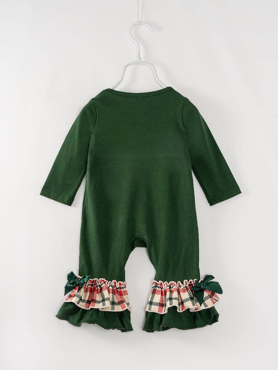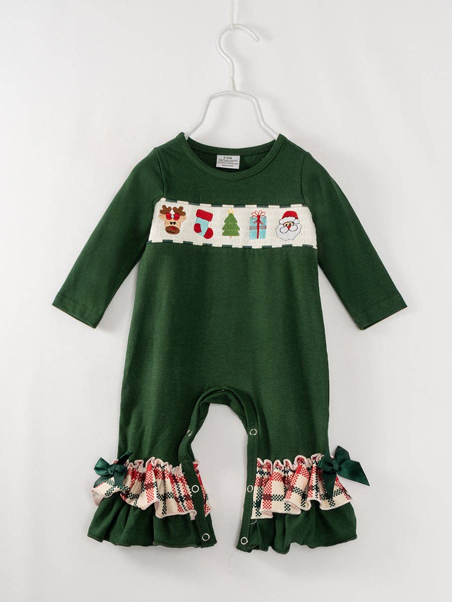 Holiday Green Ruffles and Smocked Baby Girl Romper