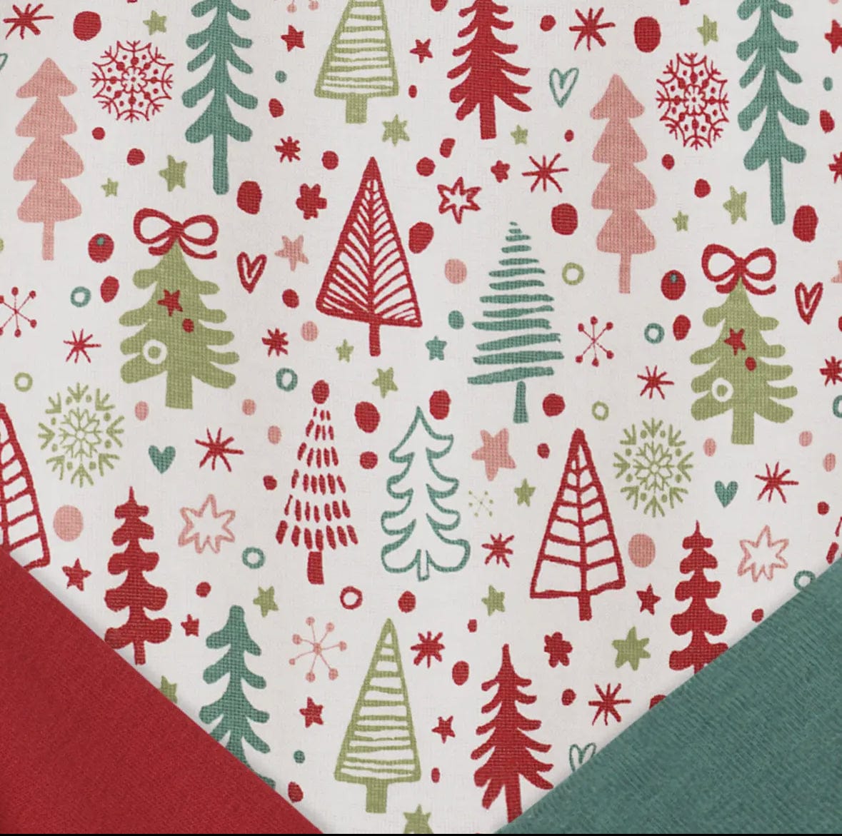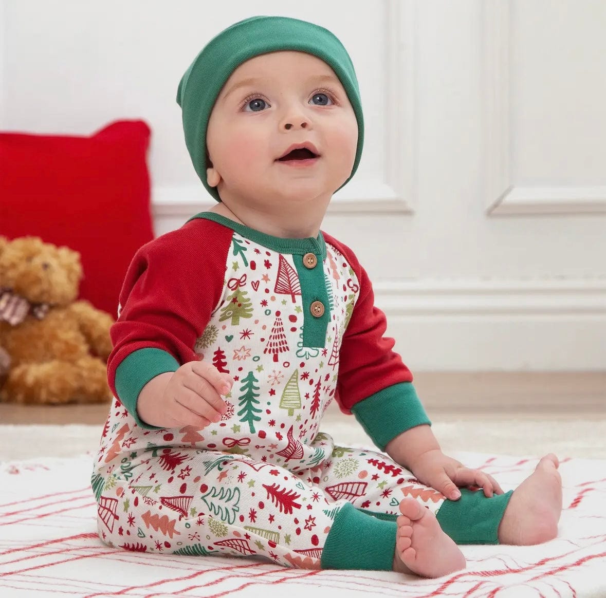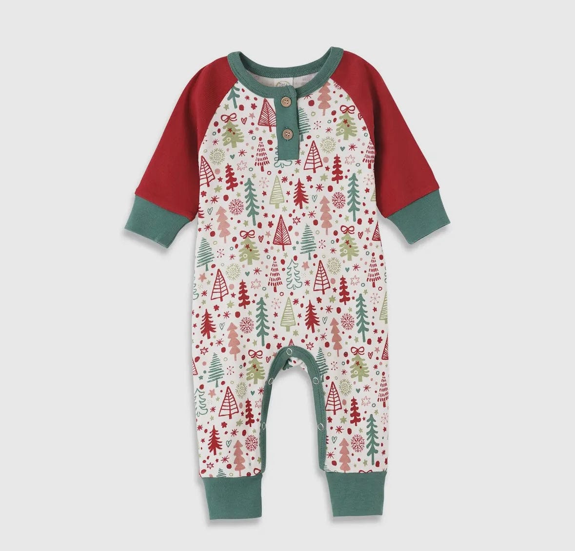 Traditional red and green colored trees in a contemporary print make this the perfect baby outfit for your family matching sets!