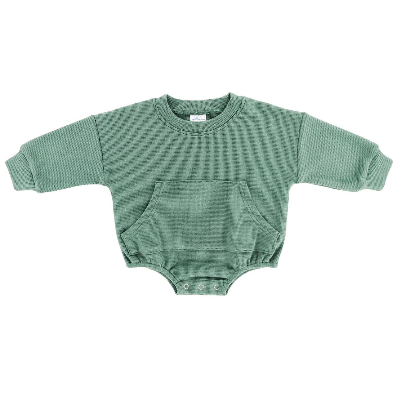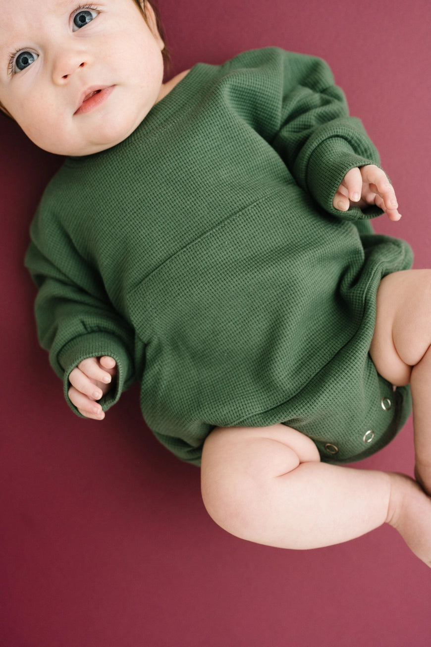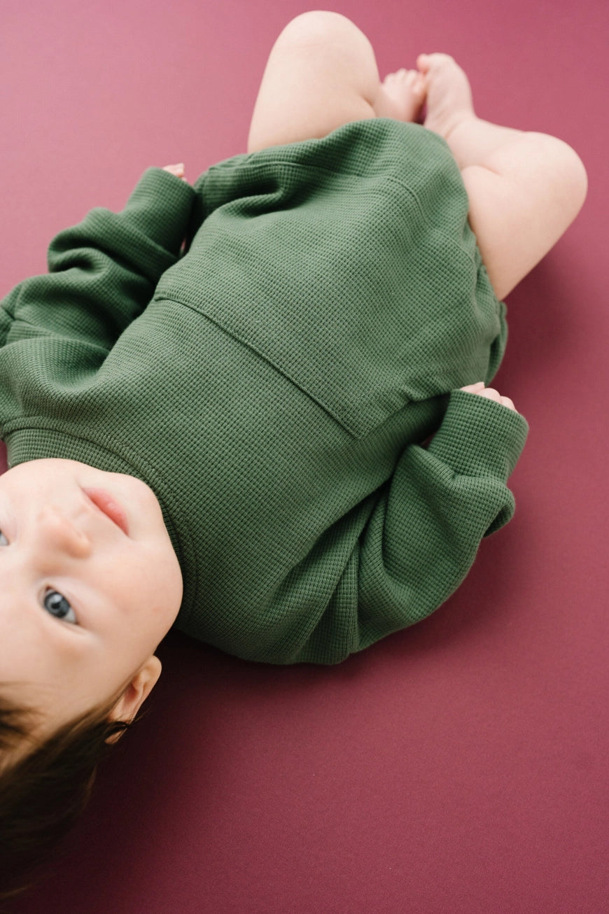 This high quality waffle knit sweatshirt style romper will be so comfy for your little boy or girl. The waffle knit fabric is on trend and the real front pocket adds to the style. Snaps at the inseam make for easy diaper changes. Accessorize with a hat or bow for a cozy fall look.