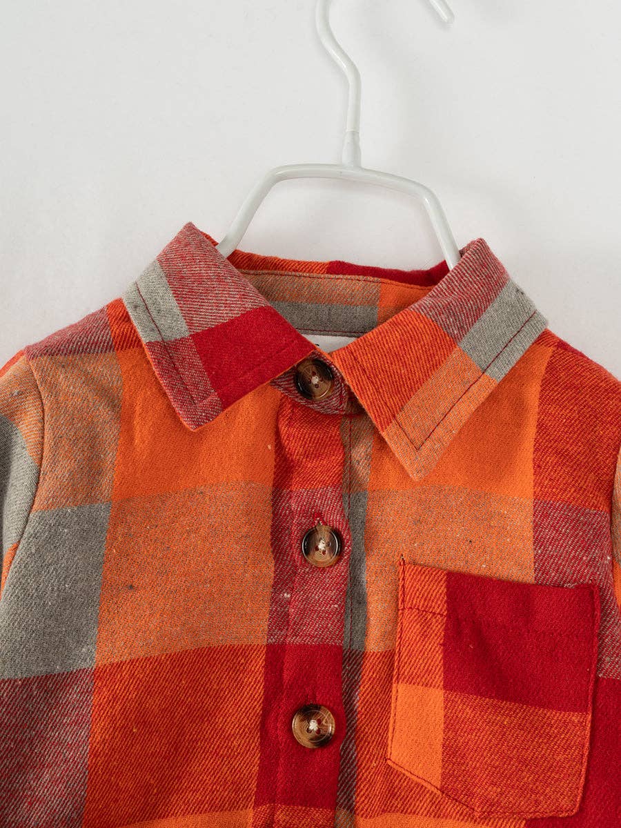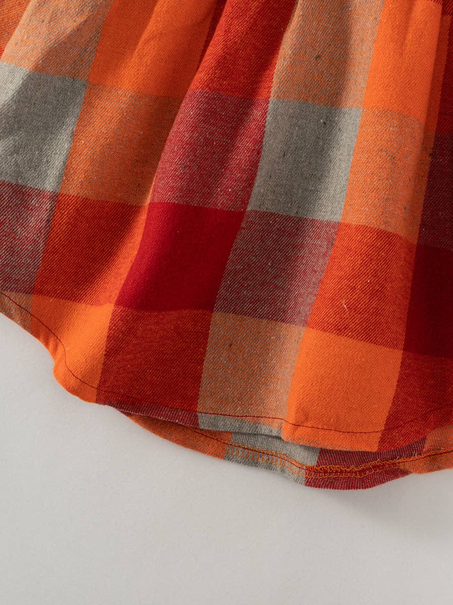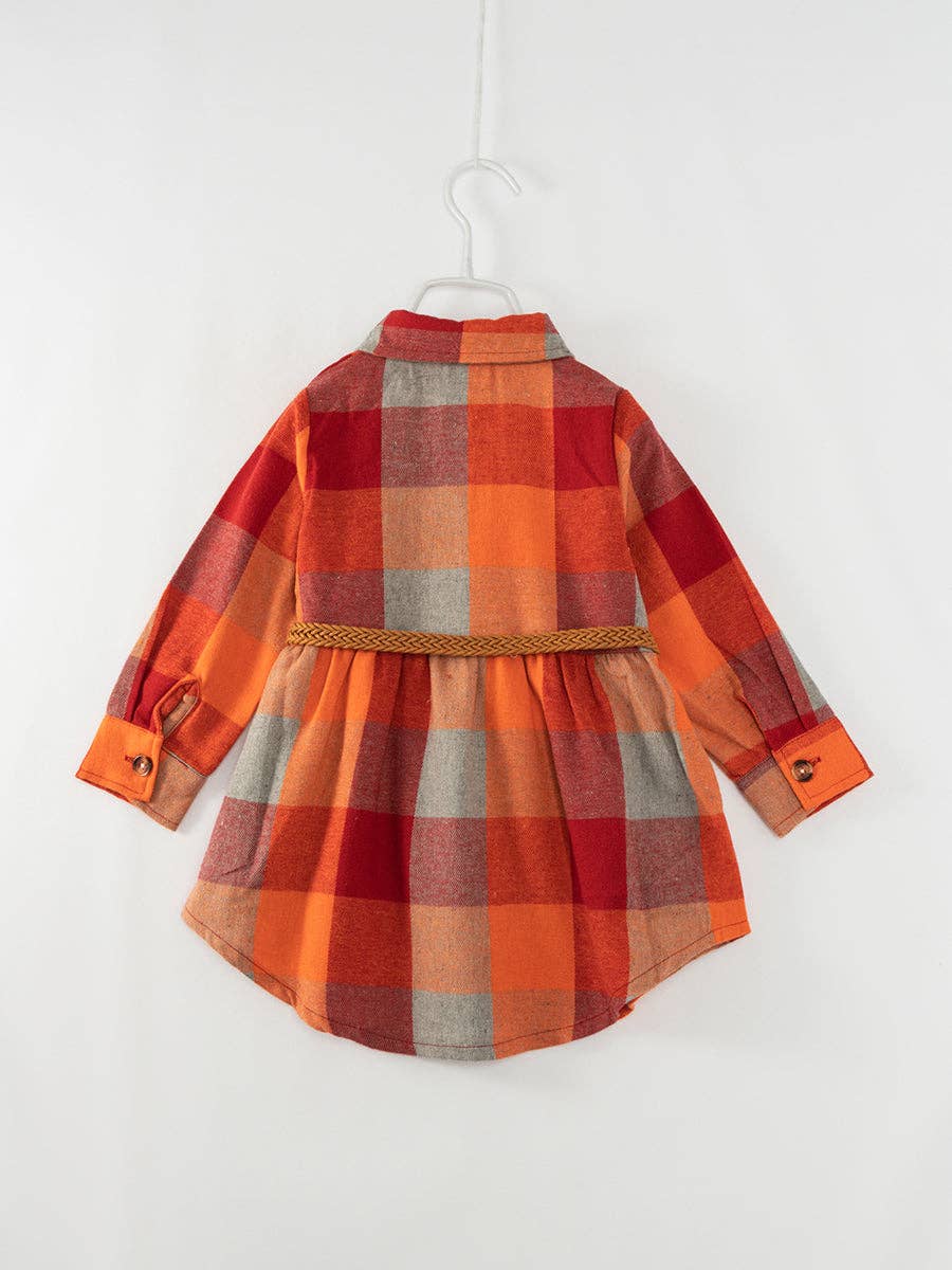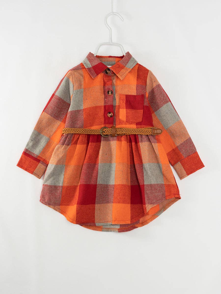 Wrap your little ones up in this cute and cozy orange plaid shirt dress! Includes a fun leather-like belt to cinch the waist. Perfect for a cozy style with a clean look. Mama will love the material and coloring, making it easy to wear, wrinkle resistant and stain resistant.