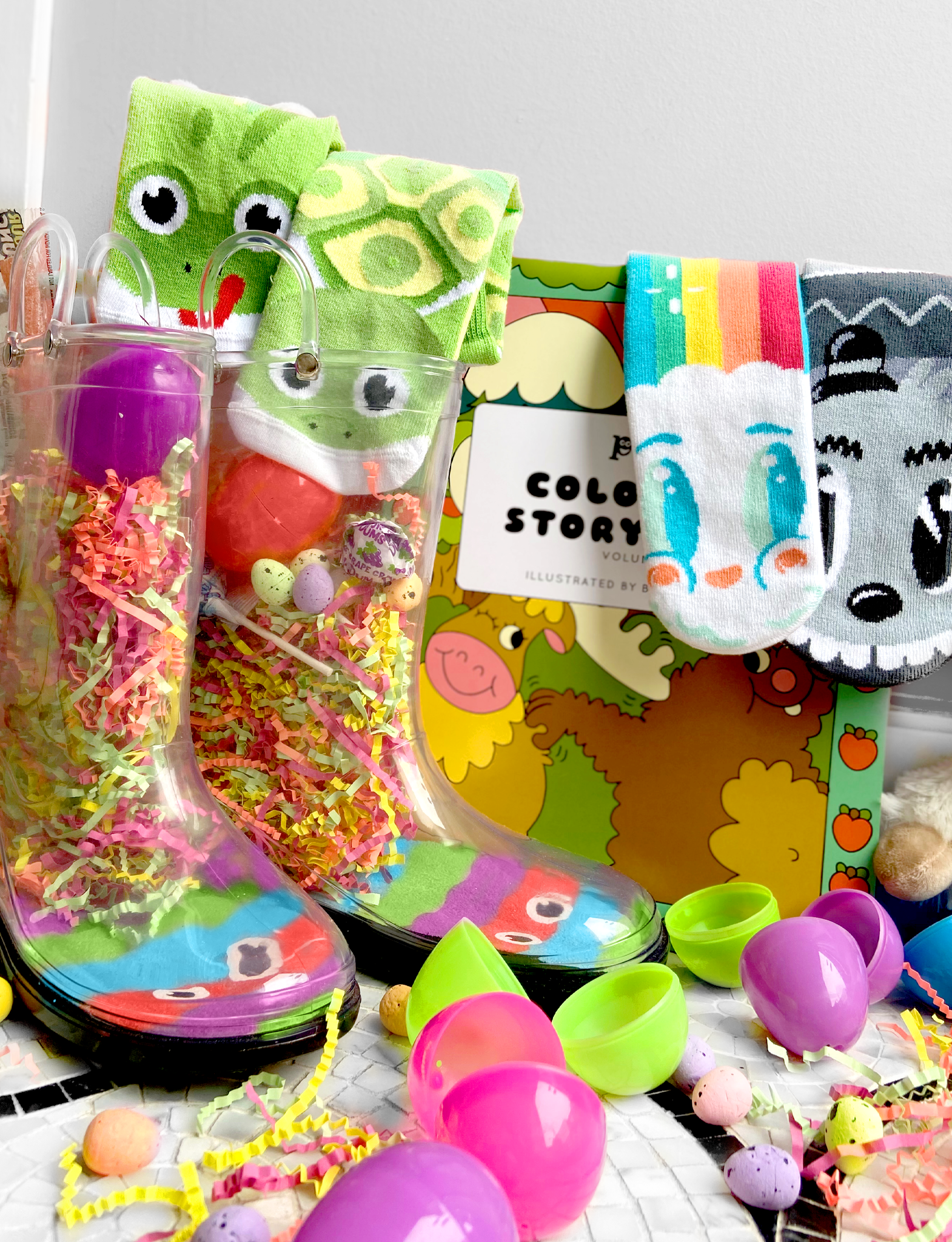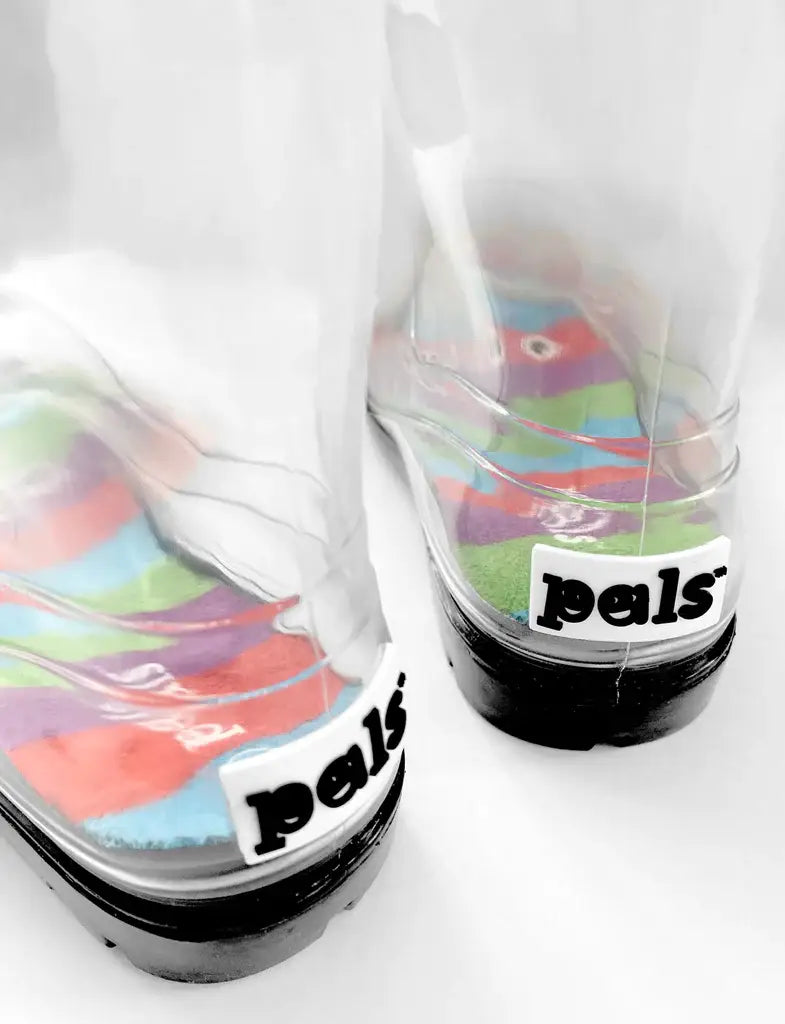 Peek A BOO-TS!!! These transparent rain boots turn gloomy days into sunshine and happiness, because now kids can SEE THROUGH THEIR SHOES!!! The perfect kids boot for Spring 2024 and Easter! These boots feature handles for easy pull-on, they keep feet dry, and we love seeing the SUPER FUN colorful insoles as your little ones stomp through puddles! These boots are the perfect add-on for anybody giving the gift of Pals Socks - a fun birthday present for any small human! Perfect for outside play on muddy days!
