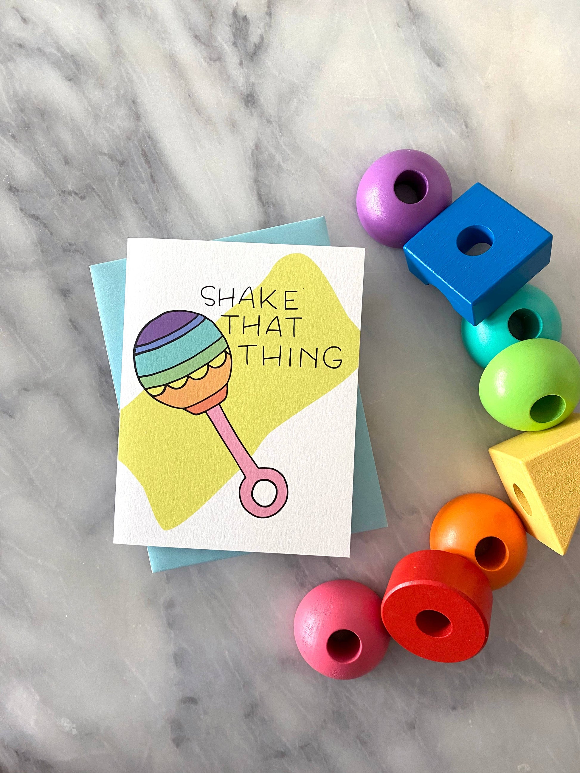 Colorful rattle for the percussion prodigy in your life. Perfect for a baby shower or for celebrating a new baby.